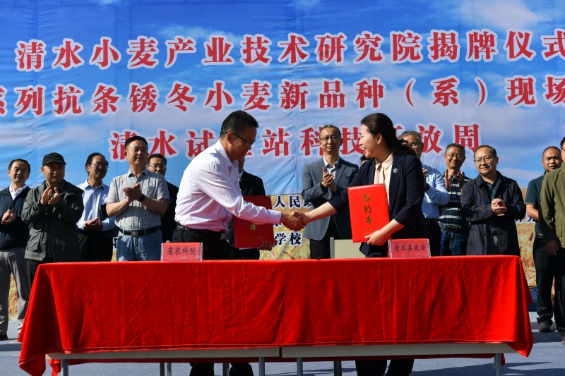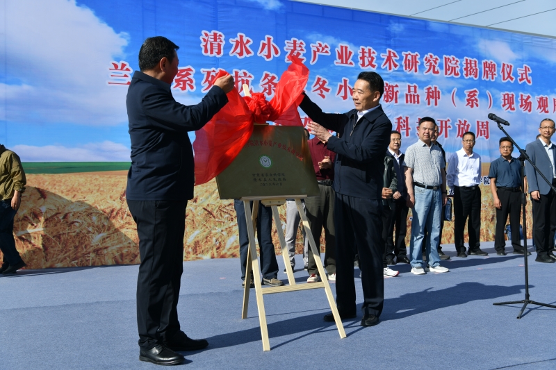 6月14日,甘肃省农业科学院(清水)小麦产业技术研究院在清水试验站正式挂牌成立。院党委书记刘国汉主持揭牌仪式,院长马忠明和天水市政协主席、清水县委书记马越垠共同为“小麦产业技术研究院”揭牌,省种子总站党委书记、站长吕小瑞和天水市副市长董小平为“国家农作物品种展示评价基地”揭牌,院党委委员、副院长杨天育和清水县委副书记、县长李菊霞现场签订了“甘肃省农业科学院-清水县人民政府小麦产业技术研究合作协议”。甘肃省农业科学院、天水市、清水县、天水农校和中国农业科学院、中国科学院、四川省农业科学院、贵州省农业科学院、西北农林科技大学、甘肃农业大学、省科技厅、省农业农村厅、省种子总站、省农技总站、省植保站和天水农校的嘉宾、领导和专家以及省内相关小麦科研、管理、教学、推广、企业(合作社)的代表260余人参加了揭牌仪式。