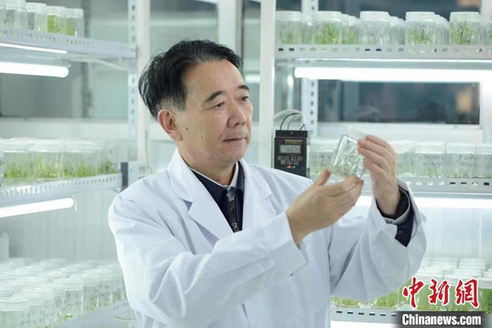 资料图为马忠明在实验室查看玉米幼苗。 中新社发 甘肃省农科院 供图