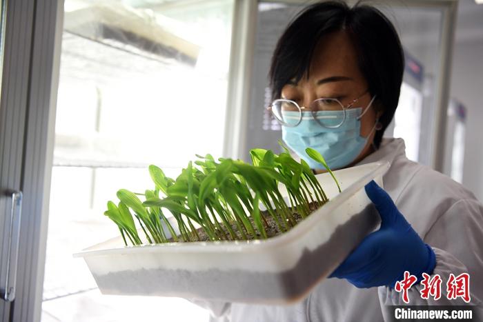 资料图为甘肃张掖国家级玉米种子生产基地种子质量监督检验中心工作人员对在土壤中育出的幼苗进行检验。 中新社发 杨艳敏 摄