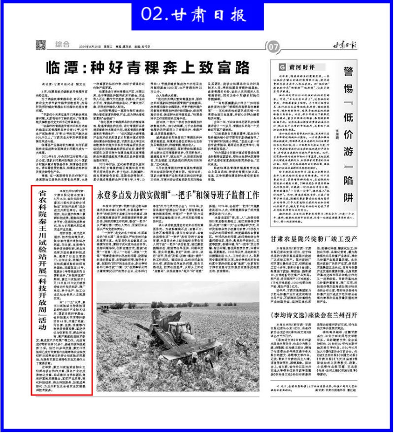 8月20日,甘肃日报刊发《省农科院秦王川试验站开展“科技开放周”活动》。