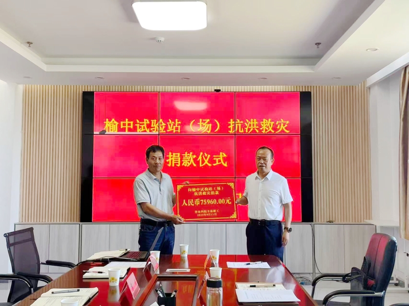 9月11日,院长、党委副书记常宏率队赴榆中试验站(场),举行抗洪救灾爱心捐款交接仪式。