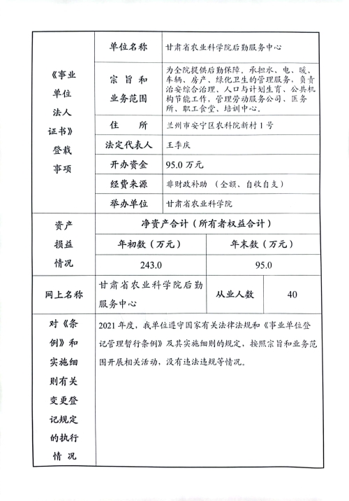根据甘肃省事业单位登记局法人证书年检流程,我单位法人证书的年检报告书需在院局域网上进行公示,现将我单位2021年度事业单位法人年度报告书予以公示,对报告书填写内容的真实性给予监督。