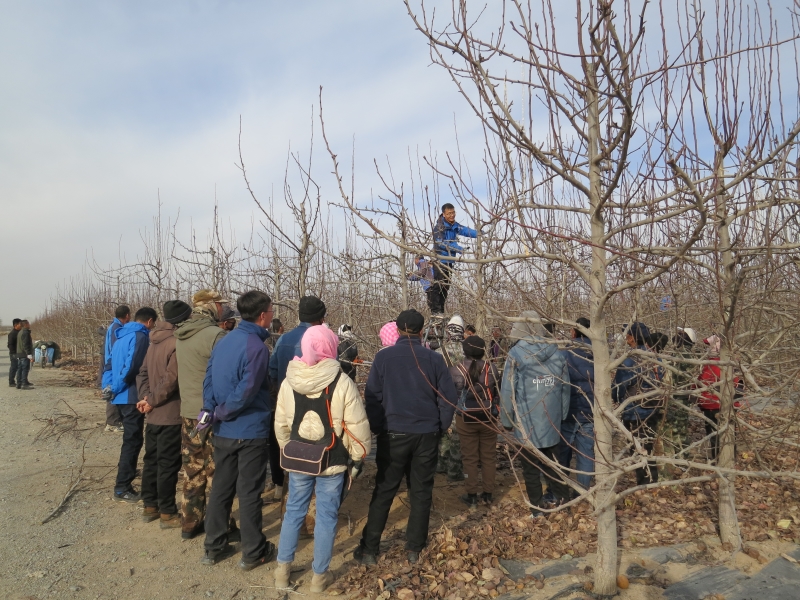 在甘肃条山集团梨示范园,李红旭研究员针对新建省力密植梨园与传统栽培模式梨园农户修剪中存在的问题,从两种栽培模式树体整形要点,今年冬季修剪重点要解决的树体上强、主枝过多、结果枝组偏大、树冠郁闭等问题,以及解决这些问题的整形修剪方法与思路,并在条山集团梨种植基地的山坡地、二斗、三队、六队、十三队等不同片区梨园开展修剪示范培训5场次,同时结合冬季修剪发放《梨宽行密植立架栽培技术规程》、《果树枝条堆肥还园技术规程》、《苹果营养诊断技术规程》等3项标准200份。本次累计培训条山集团技术人员、梨园管理职工及周边种植大户及果农240余人次,培训受到企业和果农的一致好评,取得了良好的效果。