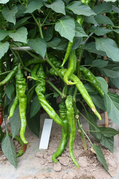 特征特性:辣椒杂交一代品种。2018年通过国家品种登记。极早熟,生育期短,植株长势中。果实羊角形,果基少皱褶,纵径22-25cm,横径3cm,果肉厚3mm,单果重45-50g。果面光泽度较好,耐运输。结果期集中,丰产性好。辣味浓,肉质细,品质优良。中抗辣椒疫病。一般亩产量4000kg左右,适宜甘肃省保护地接茬及露地栽培,适宜密植。