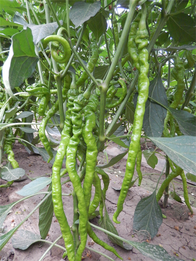 特征特性:制干加工专用品种。中早熟,植株长势较强,果实细长羊角形,果面轻微皱褶,果长28-30cm,果肩宽1.8-2.2cm,果肉厚2.2mm,单果重28-35g。光泽度中,耐运输。丰产性较好,制干率高。香辣。中抗病毒病,中抗炭疽病,中抗辣椒疫病。一般亩产鲜椒3200kg,干椒330kg左右。适宜甘肃、陕西省露地种植。