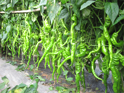 特征特性:陇椒11号属早熟一代杂种,生长势强,株高88cm,株幅74cm,单株结果数23个、果实羊角形、果长29cm、果宽3.5cm、肉厚0.25cm,平均单果重60g,果色绿,果面皱、味辣,果实商品性好。干物质含量6.66 g/100g,维生素C含量是53.4mg/100g,可溶性糖含量2.3g/100g,品质优良,耐低温寡照。经省农科院植保所对辣椒疫病在苗期进行人工接种抗病性鉴定,陇椒11号属中抗类型;辣椒白粉病田间自然发病抗性鉴定,陇椒11号属抗病类型。