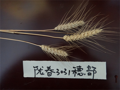 审定编号:甘审麦2015001。特征特性:春性,株高85厘米。分蘖成穗率高,亩成穗数35.1~57.3万,长芒白穗,穗长方形,籽粒琥珀色、长粒、大粒、角质,饱满度好,穗粒数31~48粒,千粒重43.2~56.3克,容重792~833克/升,生育期98天,表现高产、中早熟、广适等特性,灌浆速度快,成熟落黄好,籽粒饱满度好,株型紧凑,整齐度好,丰产性优,适应性广。粗蛋白(干基)13.38%,湿面筋28.3%,Zeleny沉降值34.5毫升,面团吸水量64.1mL/100克,形成时间4.0分钟,稳定时间5.2分钟,弱化度97F.U,粉质质量指数75毫米。经鉴定,苗期对混合菌表现感病,成株期总体表现中抗。