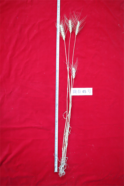 技术特点:陇春45号(甘审麦20230007)春性,早熟,株高91.1厘米,生育期101天。在甘肃省中部旱地春小麦区试中,两年10点(次)产量水平100.3~360.59kg/亩,平均产量214.68kg/亩,较对照增产5.41%。生产试验,5试点均较对照西旱2号增产,平均产量175.6kg/亩,较对照增产11.52%。长芒白穗,穗长方形,籽粒红色、角质、长方,饱满度较好,穗粒数31-48粒,千粒重43.3g,容重802g/L。田间表现早熟,灌浆速度快,成熟落黄好,籽粒饱满度好,株型紧凑,茎秆弹性好,抗倒性强,穗层整齐,丰产性和适应性好,综合性状优良,适应性广。苗期对条锈病混合菌表现高抗,成株期对供试小种及混合菌表现中抗,总体表现为中抗。苗期对白粉病混合菌表现中感,成株期对自然诱发的白粉病表现中抗,总体表现为中抗。粗蛋白含量(干基)16.04%,湿面筋38.5%,面团吸水量62.3mL/100g,形成时间3.3min,稳定时间2.1min,弱化度156F.U,粉质质量指数46mm,评价值44,属中筋小麦。
