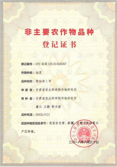 陇油杂1号系甘肃省农业科学院作物研究所组配而成的甘蓝型春油菜三系杂交种。陇油杂1号生育期120天,较现有主栽品种青杂5号早5天。苗期叶片大,叶色深绿,花瓣大而平,花期集中,株型紧凑。株高147cm左右,一次有效分枝数4~7个,单株果数175个左右,角粒数25.5粒,千粒重3.67克,含油率44.57%,硫苷10.28umol/g,芥酸0.12%,品质达到双低标准。2013~2014年的组合比较试验中, 陇油杂1号折合亩产265.8公斤,较对照青杂5号增产8.3%;2015、2016年甘肃省春油菜区域试验中,两年10点次平均折合亩产254.50公斤,较对照青杂5号增产7.49%,位居参试品种第一位,具有良好的丰产性和稳产性。省区试及多点示范表明,陇油杂1号适宜新疆、内蒙、甘肃等春油菜区推广种植。