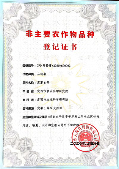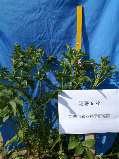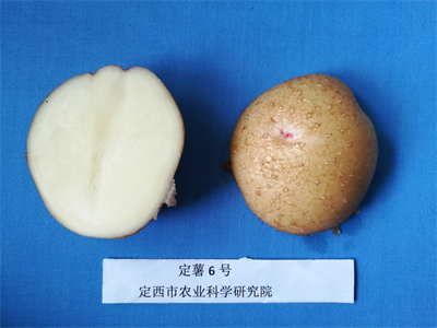 定西市农业科学研究院选育。晚熟,生育期122天左右,株型直立,株高50厘米,成株繁茂。茎粗壮, 茎绿色,叶绿色,分枝中等。花冠紫色,花期较长,天然结实少;薯形圆形,白皮白肉,芽眼浅,芽眼红色,薯皮较粗,薯形评价好;结薯集中,单株平均结薯数4.9个,平均单薯重112.4克,薯块商品率76.3﹪。薯块干物质含量29.5克/100克,淀粉含量21.59﹪,粗蛋白含量2.95克/100克,VC含量17.3毫克/100克,还原糖含量0.10克/100克,适合鲜薯食用、淀粉、全粉和薯片加工。耐运输、贮藏;耐旱耐瘠,抗晚疫病,耐病毒病,田间未见环腐病、黑胫病、纺锤块茎病发生。平均亩产量1500-3000kg。