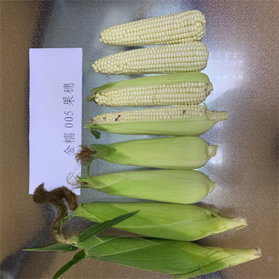 金糯005鲜果穗籽粒排列整齐、饱满,色泽纯正,外观商品性好;籽粒粘糯,煮食风味鲜、软、香、粘、糯,嫩薄无渣,口感佳,适口性好,品尝鉴定得分86.3。农业农村部谷物及制品质量监督检验测试中心(哈尔滨)检测,干籽粒含粗蛋白0.87%,粗脂肪4.33%,粗淀粉71.84%,粗淀粉中支链淀粉含量100%。