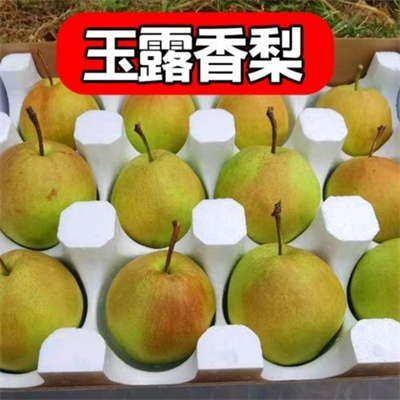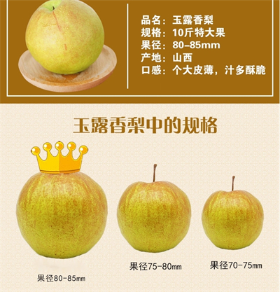 戈壁金露“玉露香梨”产地位于甘肃省金昌市永昌县水源镇,该梨平均单果重236.8g,最大可达462g;果实近球形,果形指数0.95,果面光洁细腻具蜡纸,保水性强。果皮薄,果心小,可食率高(90%)。果肉白色酥脆,无渣,石细胞极少,汁液特多,味甜具清香,口感极佳;硬度在3.15-3.24kg/cm2之间,可溶性固形物含量在12.9-14.1%之间,总糖含量在8.9%-10.1%之间,主要由果糖、葡萄糖、山梨糖醇和蔗糖构成;其中,果糖含量最高,在60.98-77.89mg/g之间,葡萄糖含量次之,在25.14-47.05mg/g之间,山梨糖醇含量为11.08-18.13mg/g,蔗糖含量最少。果实营养丰富,品质极佳。