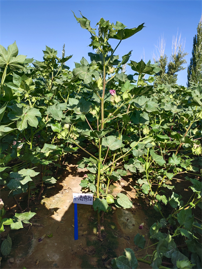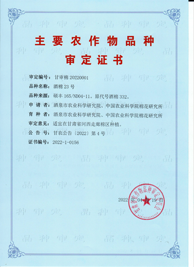 品种简介:酒棉23号(原代号酒棉332)由酒泉市农业科学研究院与中国农科院棉花研究所联合选育,2022年通过甘肃省品种审定。生育期135天,霜前花率92.8%。单株结铃7.9个,单铃重5.7g,衣分41.3%。纤维平均长度31.6mm,比强度31.3cN/tex,马克隆值4.0。耐枯萎病、抗黄萎病。亩产籽棉350.2kg、皮棉157.8kg。