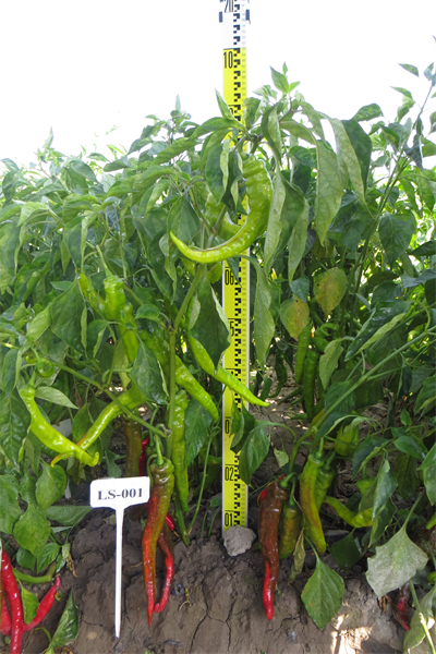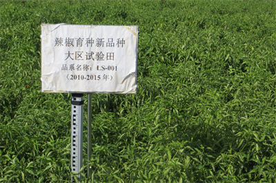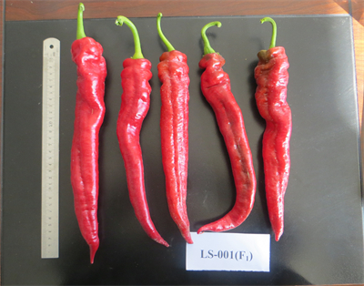 LS-001株高88.7厘米,株幅60厘米,始花节位9-11节,叶色深绿,株型直立,羊角形,果长25.4厘米,果粗3.58厘米,果肉厚度0.302厘米,单果重84.3克,单株结果数21个,商品果颜色绿色,开花结果期60天,生育期110天,亩产4545.5kg。植株长势强,株型紧凑,抗病性强,果大,肉质厚,果面光滑,口感好,辣味适中,抗辣椒疫病,中熟一代杂交种。每百克鲜重Vc含量128.7mg,粗蛋白0.89g,可溶性糖3.5g,可溶性固形物6.0%,辣椒素127mg/kg,味微辣,宜鲜食。适宜在甘肃省武威及周边河西地区气候条件类似的区域春季保护地及露地种植。