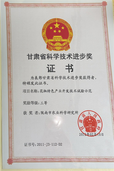 《花椒特色产业开发技术试验示范》项目成果获得陇南市科技进步一等奖和甘肃省科技进步三等奖,成果主要内容:
