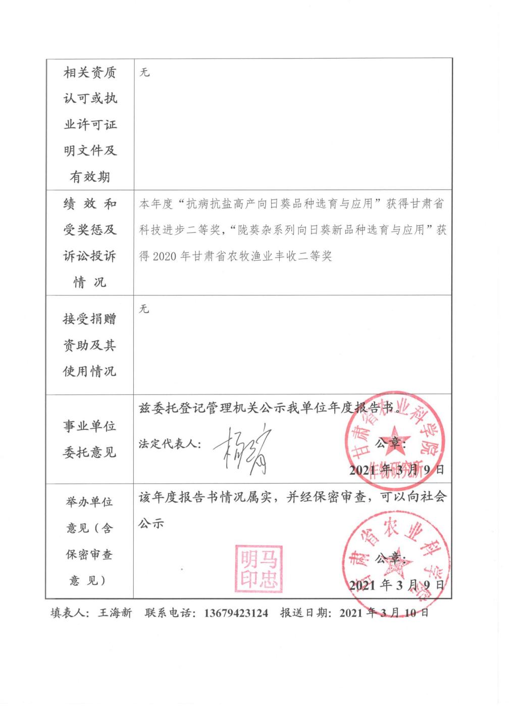 根据甘肃省事业单位登记局法人证书年检流程,现将我单位2020年度事业单位法人年度报告书予以公示,对报告书填写内容的真实性给予监督。