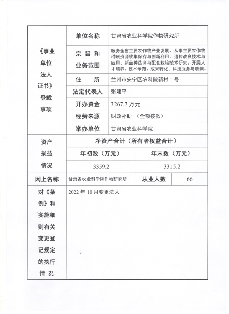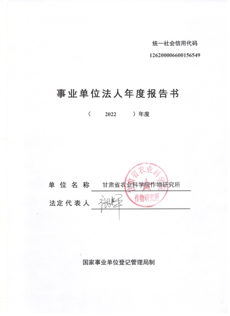 根据甘肃省事业单位登记局法人证书年检流程,我单位法人证书的年检报告书通过网上已提交甘肃省事业单位登记局审核通过,按流程需在院局域网上进行公示,现将我单位2022年度事业单位法人年度报告书予以公示,对报告书填写内容的真实性给予监督。