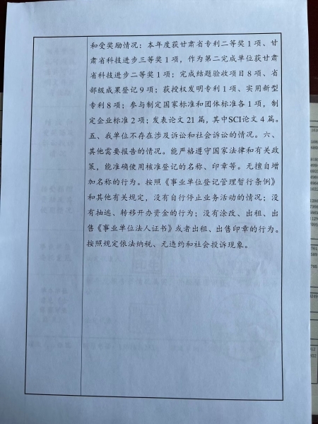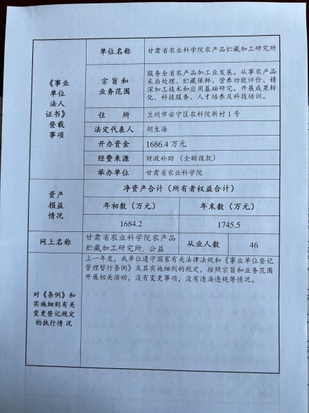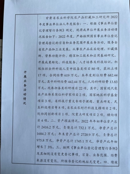 根据甘肃省事业单位登记局法人证书年检流程,我单位法人证书的年检报告书通过网上已提交甘肃省事业单位登记局审核通过,按流程需在院局域网上进行公示,现将我单位2022年度事业单位法人年度报告书予以公示,对报告书填写内容的真实性给予监督。