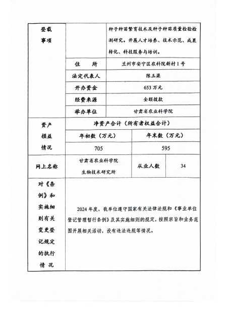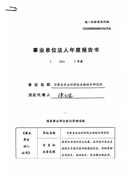 根据甘肃省事业单位登记局法人证书年检流程,现将我单位2024年度事业单位法人年度报告书在院局域网予以公示,对报告书填写内容的真实性给予监督。