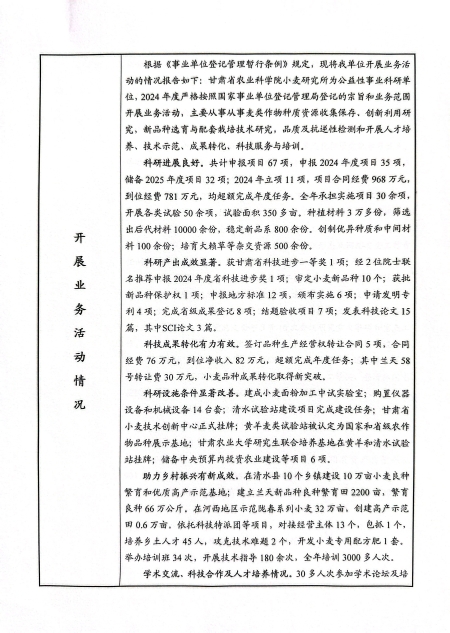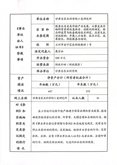 根据甘肃省事业单位登记局法人证书年检流程,现将我单位2024年度事业单位法人年度报告书在院局域网予以公示,对报告书填写内容的真实性给予监督。