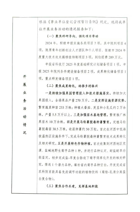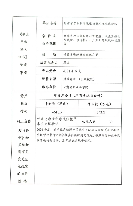 根据甘肃省事业单位登记局法人证书年检流程,现将我单位2024年度事业单位法人年度报告书在院局域网予以公示,对报告书填写内容的真实性给予监督。