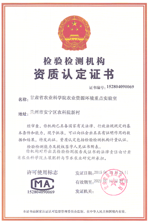 始建于1958年,2015年通过甘肃省质量技术监督局CMA资质认证。主要开展土壤检测和技术咨询服务工作。内设综合业务室、理化检验室、微生物检验室。对我省农业投入品、农田环境质量进行检验;为农业科研和生产提供测试分析数据;作为开放实验室为农业科研提供平台;开展测试分析方法研究;及测试分析人员进行指导培训等。现有职工15名,其中高级技术人员5名,中级技术人员9名,大专以上学历的人员占94 %。拥有大中型分析仪器设备41台件,价值总额800余万元。其中资源环境监测分析实验室拥有流动注射分析仪、紫外分光光度计、原子吸收分光光度仪、原子荧光仪、火焰光度计、凯式定氮仪等;微生物实验室有Biolog全自动微生物鉴定系统、正置(倒置)显微镜、PCR仪、DNA提取系统、10-200升发酵罐、高速冷冻离心机等仪器设备。有规范的实验室 20间4200平方米。具备开展土壤、植物、灌溉水、化肥、有机肥5大类234个产品、62个参数的检测技术能力和报告能力。土壤检测共35项:汞、砷、镉、铬、镍、硒、铜、锌、铅、交换性钙、交换性镁、全氮、全磷、全钾、水解氮、速效磷、速效钾、硝态氮、铵态氮、阳离子代换量、全盐、pH、八离子、水分、有效硼、有效锌、有效锰、有效铜、有效铁、碳酸钙、有机质、容重、碱化度、碳酸盐。植株检测共8项:全氮、全磷、全钾、有机碳、粗蛋白、蛋白质、水分、粗灰分。灌溉水检测共19项:汞、砷、镉、铬、镍、硒、铜、锌、铅、铁、钙、钾、钠、镁、六价铬、氯化物、全盐、pH、总氮、总磷。有机肥料检测共13项:有机质、氮、磷、钾、水分、汞、砷、镉、铬、铅、外观标识。化肥检测共24类:复混肥料、掺混肥料、有机-无机复混肥料、过磷酸钙、农业用硫酸钾、重过磷酸钙、氯化钾、缓释肥料、尿素、硫酸铵、磷酸一铵、磷酸二铵、生物有机肥、含腐殖酸水溶性肥料、大量元素水溶肥料、硝酸铵、复混微生物肥料、生物发酵肥、控释肥料、脲醛缓释肥料、稳定性肥料、中量元素水溶肥料。
