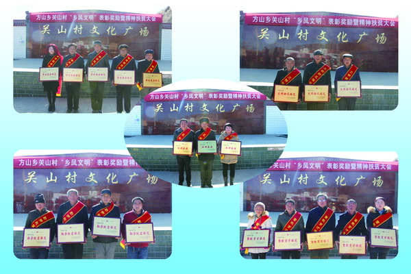 会上,关山村党支部书记、村委会主任白生银宣读了“方山乡关山村党支部关于开展乡风文明评选活动表彰奖励的决定”,各位领导向受到表彰的五好家庭、勤劳致富模范、重教育才模范、孝老爱亲模范、文明新风模范20名获奖者进行了颁奖和授牌,五好家庭获得者贺德宝代表受表彰模范发表了获奖感言,方山乡政府副乡长杜金田发起了向全村模范学习的倡议;高亚丽书记对此次大会的召开讲了五点体会,马彦处长就帮扶单位发挥好帮扶作用讲了具体意见,李存常委对增强内生动力,推进乡风文明,聚焦产业培育,着力脱贫攻坚提出了新要求。