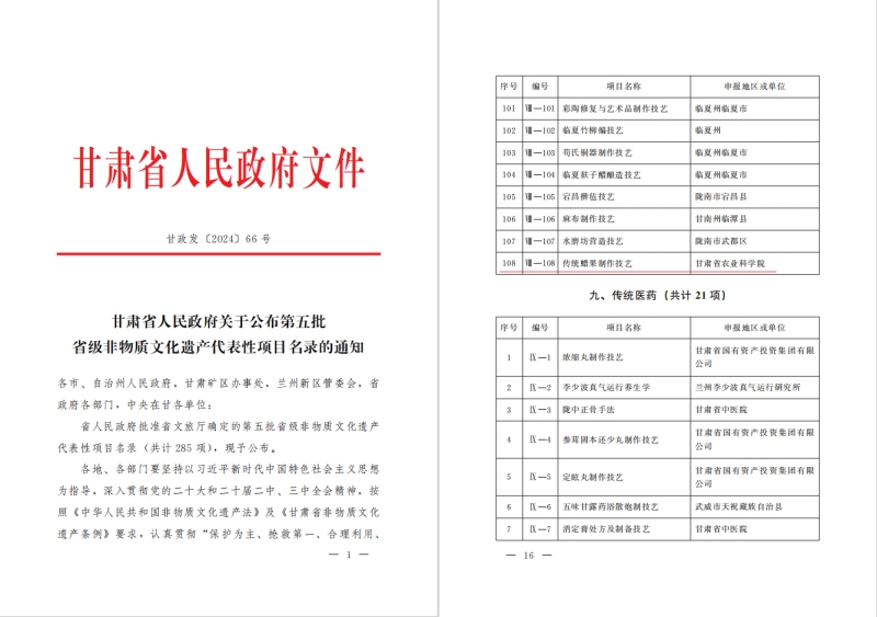 日前,《甘肃省人民政府关于公布第五批省级非物质文化遗产代表性项目名录的通知》《兰州市人民政府关于公布第四批市级非物质文化遗产代表性项目名录的通知》相继发布,由我院申报的“传统蜡果制作技艺”入选省、市两级非物质文化遗产传统技艺类代表性项目。
