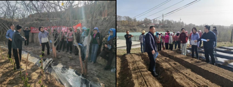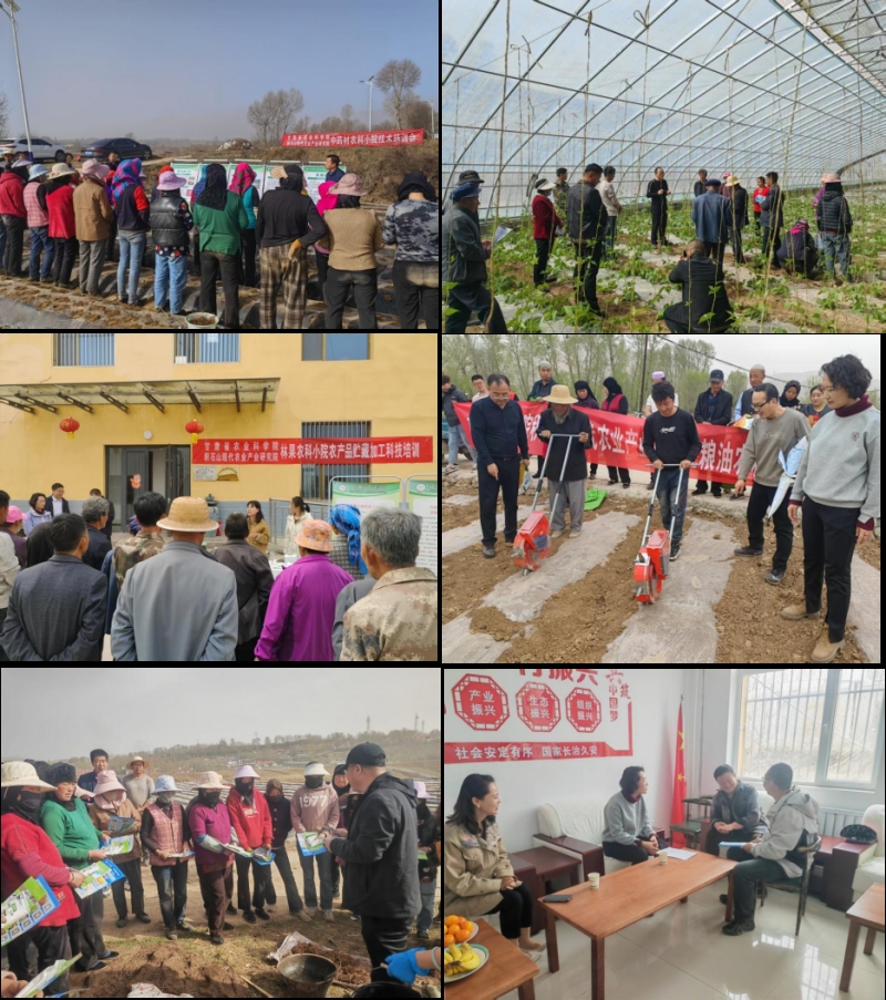 “林果农科小院”针对椒园春季花果管理要点,就花前复剪追肥、金银花间作套种、土壤覆膜保墒、嫁接技术、水肥管理、病虫害防控等重点问题向农户进行了示范讲解;农产品贮藏加工团队为当地农户培训了农产品贮藏技术要点和为农业加工企业提供蔬菜加工技术指导。“中药材农科小院”针对黄芪、当归等道地药材的播种期管理,从土壤墒情监测到覆膜技术全流程讲解了药材标准化生产中存在的问题及解决措施。“蔬菜农科小院”现场发放了良种和“技术明白纸”,重点讲解了瓜菜新品种选择、集约化育苗、水肥一体化、病虫害绿色防控和马铃薯播前耕作整地技术、黑色地膜覆盖技术、马铃薯高效绿色栽培技术。“畜牧业农科小院”围绕肉羊养殖春季防疫、牧草种植青贮等内容,发放畜草良种和培训资料,为养殖户和企业提供“一对一”技术服务。“粮油农科小院”聚焦玉米和油菜产业,捐赠良种和播种机械,与农户互动答疑,现场解答种植难题,示范机械化整地、精量播种及抗旱覆膜技术。同时,产业研究院工作队与合作社、企业进行座谈,就蔬菜、牛羊养殖、中药材和特色林果产业的发展和需求进行了调研。
