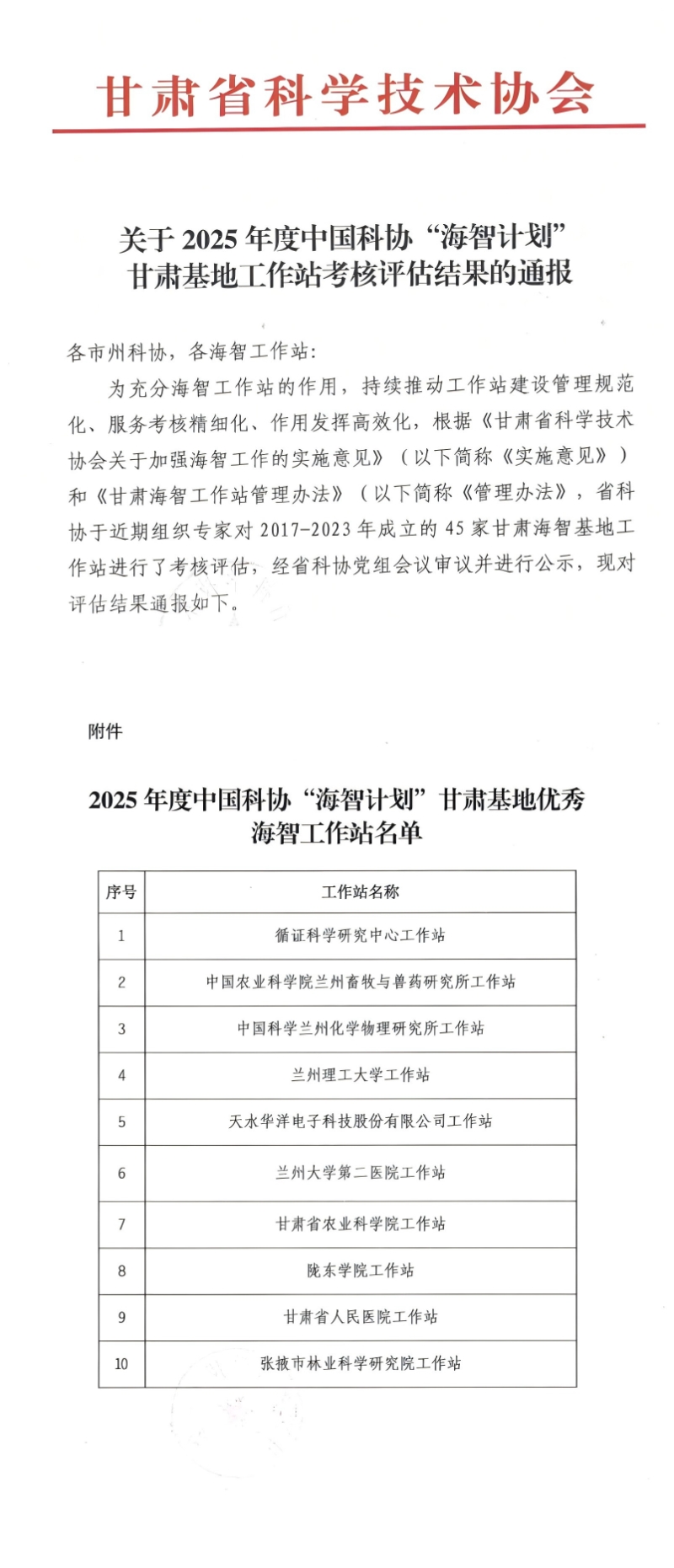 近日,甘肃省科学技术协会公布了2025年度“海智计划”甘肃基地工作站评估结果,甘肃省农业科学院海智工作站在45家参评单位中脱颖而出荣获“优秀”等级评定,已连续两年获此殊荣。此次评估结果充分体现了甘肃省农业科学院海智工作站在农业科研领域的扎实工作与显著成效,也突显了我院在推动农业科技创新、引进海外高层次人才以及促进国际科技合作等方面所作出的积极贡献。