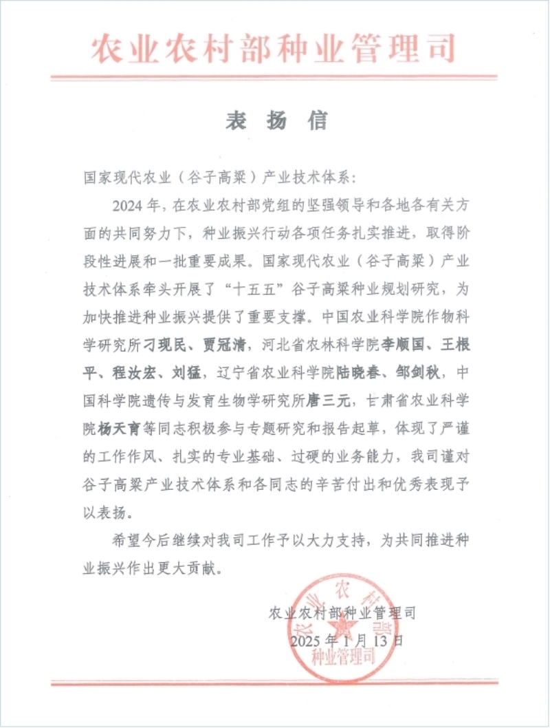 2025年1月13日,农业农村部种业管理司发来表扬信,对我院国家谷子高粱产业技术体系岗位专家杨天育研究员参与“十五五”谷子高粱种业规划报告起草工作取得的阶段性进展和成果予以表扬。