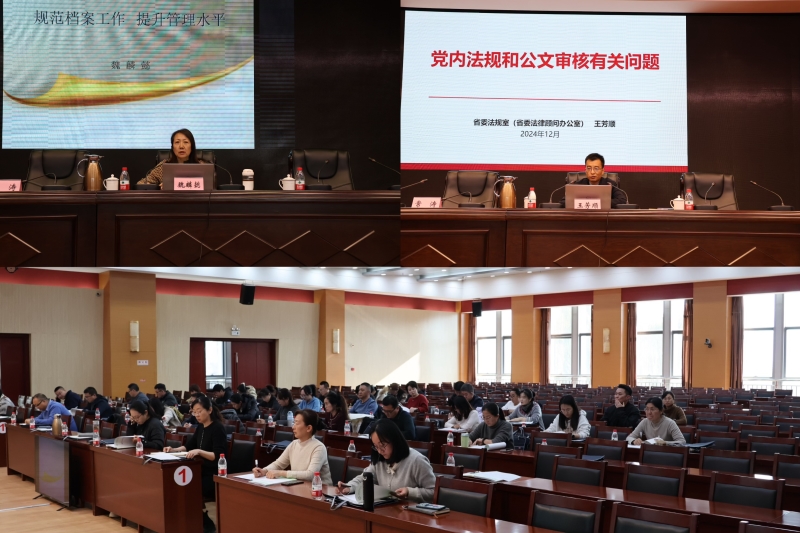 为深入学习贯彻党的二十届三中全会精神和习近平总书记对档案工作重要指示批示精神,全面提升全院档案管理和业务技能工作水平,我院于12月3日举办“文秘及档案管理业务技能提升培训班”。培训邀请省委法规室副主任王芳顺、省委办公厅(省档案局)科技档案工作处一级调研员魏麟懿重点围绕党内法规、公文写作、公文审核和档案管理等业务技能开展专题辅导,培训由院办主任常涛主持。会上,为学员配发《档案工作法规汇编》等学习资料。