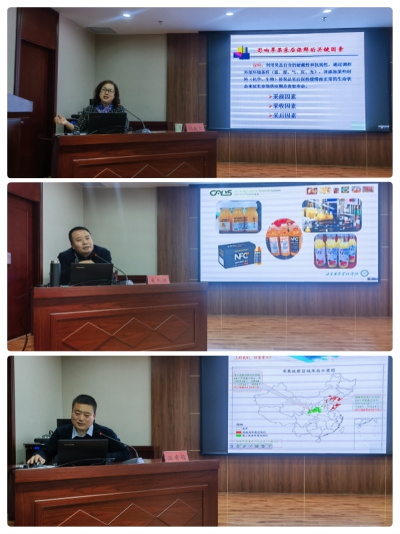 会议邀请了加工所颉敏华、康三江研究员和静宁县果业服务中心主任温有福高级农艺师分别作了技术培训。颉敏华以“苹果采后处理与贮藏保鲜技术”为题,从影响苹果采后保鲜关键因素、果品适时采收和及时入库、1-MCP处理技术等5个方面,讲解了苹果采后各关键环节的品质控制技术和应用;康三江以“苹果产后深加工增值技术创新与实践”为题,从苹果产业链发展现状、苹果精深加工技术和产品、苹果精深加工发展趋势及前景等3个方面,让学员深入了解了省内外果品加工的产业需求、果品高值化利用技术和果品加工发展趋势;温有福以“秋冬季果园管理技术”为题,从补施基肥、清园和果园改造修剪等方面,详细介绍了当前果园管理实用技术和操作要点。