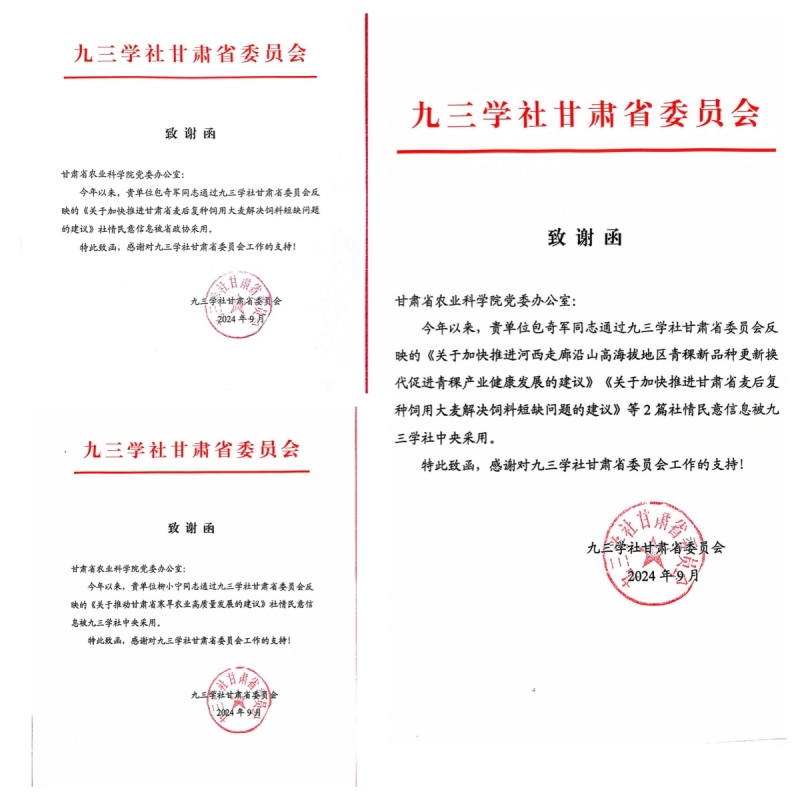 其中支社社员包奇军提交的《关于加快推进河西走廊沿山高海拔地区青稞新品种更新换代,促进青稞产业健康发展的建议》《关于加快推进甘肃省麦后复种饲用大麦、解决我省养殖饲料短缺问题的建议》;柳小宁提交的《关于推动甘肃省寒旱农业高质量发展的建议》三篇社情民意被九三学社社中央采用;包奇军提交的《关于加快推进甘肃省麦后复种饲用大麦、解决我省养殖饲料短缺问题的建议》被省政协采用。这些建议的采纳,标志着我院九三学社社员在推动地方经济和农业发展方面的意见建议得到了上级组织的认可,也为今后的工作指明了方向。