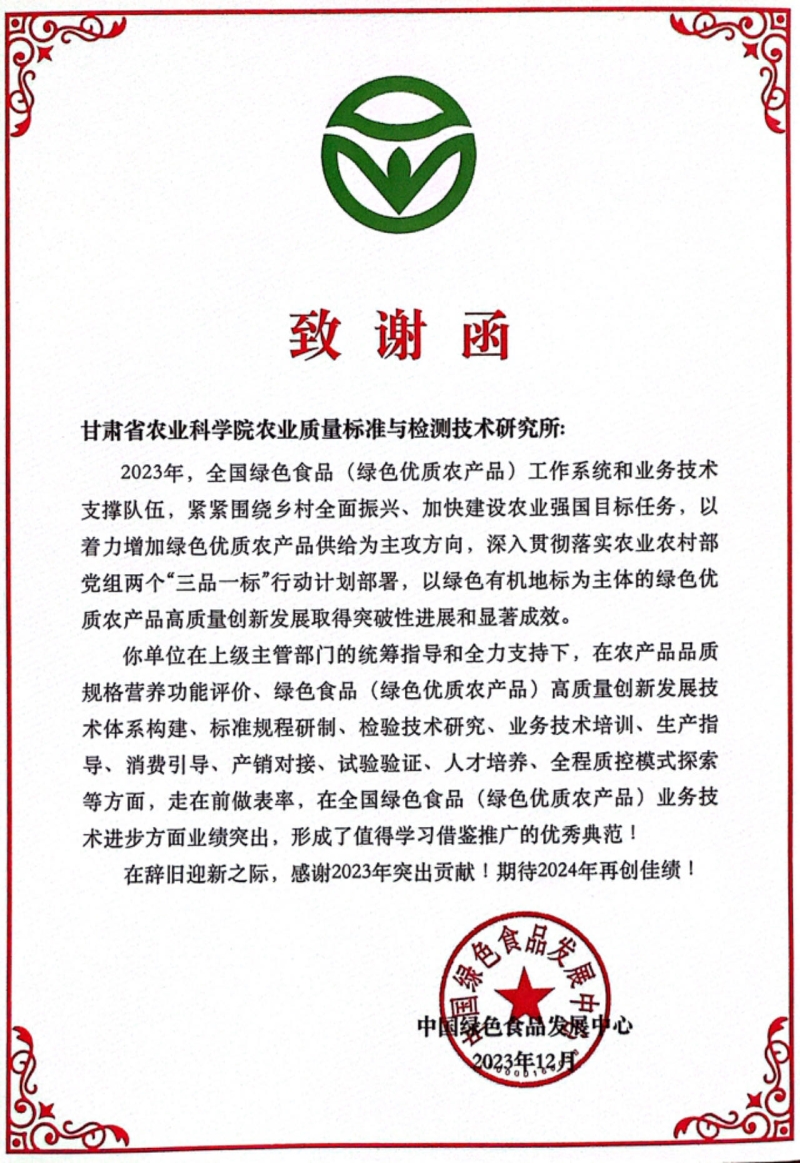 近日,中国绿色食品发展中心发来致谢函,向我院农业质量标准与检测技术研究所(畜草与绿色农业研究所)在绿色优质农产品高质量创新发展工作中发挥的积极作用给予高度认可与感谢。