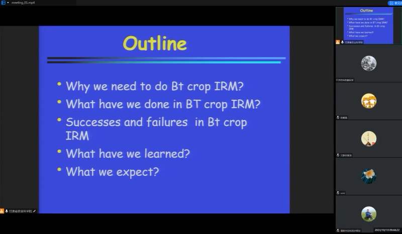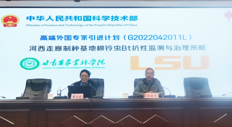 为促进甘肃农业科技创新发展,积极推动国际合作交流。10月10日,我院植保所依托科技部高端外国专家引进计划项目,邀请美国路易斯安那州立大学昆虫系L.D.Newsom特聘IPM教授——黄方能博士来我院进行合作交流,黄教授就“北美棉铃虫Bt抗性治理实施二十多年的经验、教训和启示”做了专题学术报告,报告采取“线上线下同步+现场交流答疑”的方式进行,内容丰富、现场交流热烈,参会人员一致表示受益匪浅。