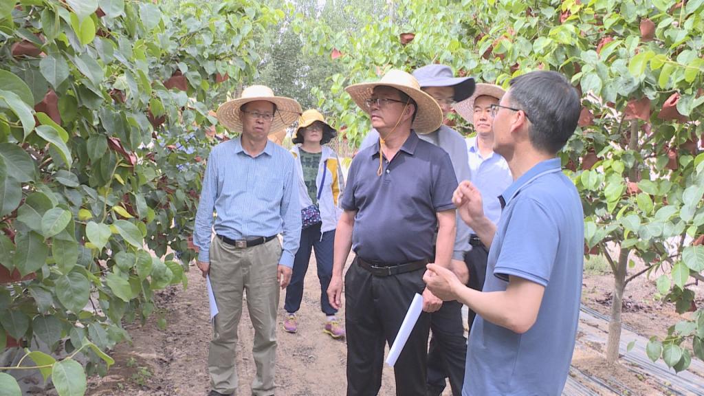 在条山农场国家梨产业体系兰州综合试验站,甘肃省农科院的专家们正与基层农技人员一起观摩梨树生长情况,并为种植户解决遇到的难题。