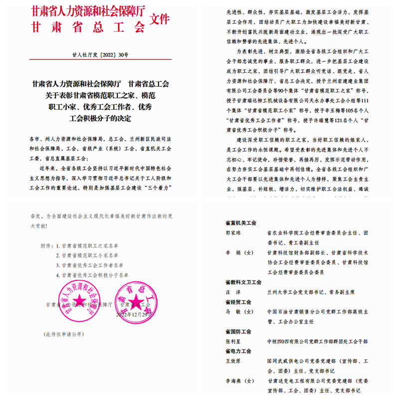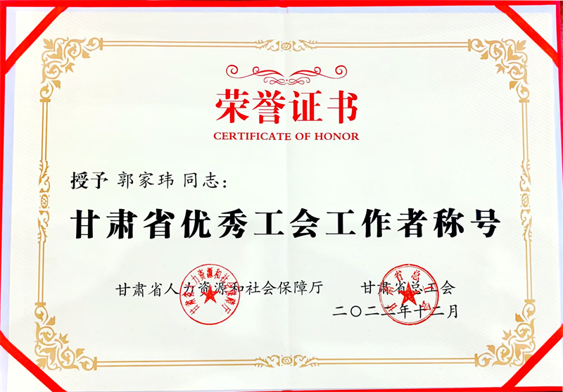 近日,甘肃省人力资源和社会保障厅、甘肃省总工会印发《关于表彰甘肃省模范职工之家、模范职工小家、优秀工会工作者、优秀工会积极分子的决定》,我院工会委员会委员、经审委主任郭家玮同志荣获“甘肃省优秀工会工作者”荣誉称号。