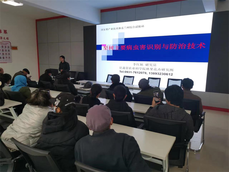 本次培训采用室内培训结合田间讲解示范。室内培训紧密围绕当地梨农在梨树病虫害管理和土壤施肥管理方面的技术需求,国家梨产业技术体系兰州综合试验站站长、林果花卉研究所李红旭研究员做了题为《梨树主要病虫害识别与防治技术》的报告,特派团成员、林果花卉研究所曹刚副研究员做了题为《梨树土壤管理与平衡施肥》的报告。针对当地梨树冬季修剪、树体结构调整和早酥梨授粉品种搭配等环节存在的问题,在界石铺镇梨园进行了整形修剪示范培训,现场解答了梨农生产中遇到的技术问题,并为示范户发放《梨园主要病虫害综合防治手册》80本、新型高效低毒农药240瓶。此次先后培训静宁县界石铺镇李堡、七里、西川、高堡等4个村的技术人员和果农150余人次,培训取得了良好效果。