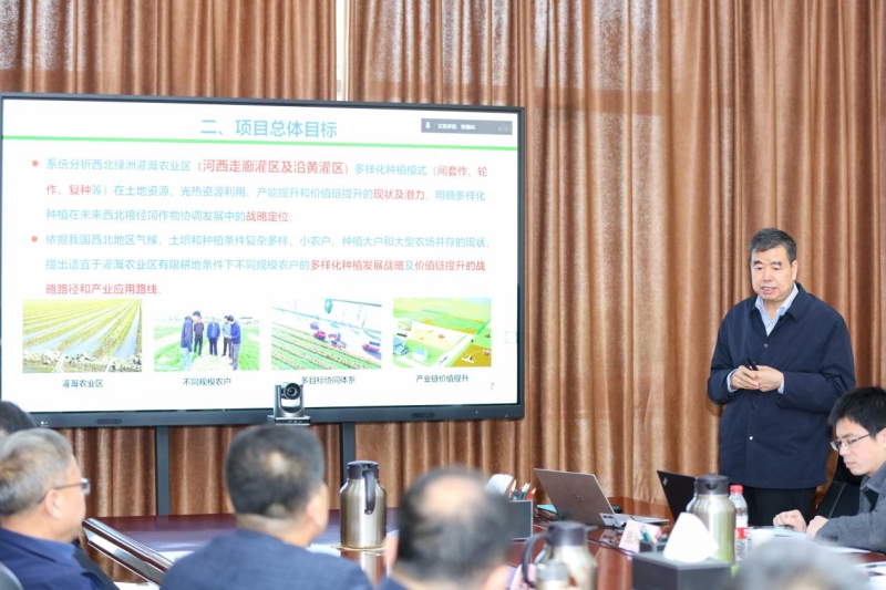 会上,项目总负责人徐明岗院士系统介绍了项目整体研究框架、技术路线与预期成果,明确项目将形成可落地的政策建议报告,报送国家相关部委及我省相关部门。两位课题负责人分别作专题汇报,全面阐述了西北多样化种植的发展现状、定位与挑战,定量分析了其增产优势,总结了小麦/玉米宽幅间作等主流种植模式,深入剖析了水资源短缺、农机农艺不配套等核心制约因素,并提出七项针对性战略对策。该项目旨在聚焦西北绿洲灌溉农业区,系统分析间套作、轮作、复种等多样化种植模式在资源利用、产能提升及价值链拓展方面的现状与潜力,结合西北地区种植条件复杂、经营主体多元的特点,研究提出适配不同规模农户的发展战略与产业应用路径,构建多目标协同的产业链价值提升体系。