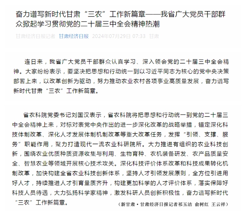 7月29日,甘肃经济日报以《奋力谱写新时代甘肃“三农”工作新篇章》为题报道我省广大党员干部群众热议党的二十届三中全会精神。院党委书记刘国汉代表我院就认真学习贯彻党的二十届三中全会精神作表态。他表示:省农科院将把思想和行动统一到党的二十届三中全会精神上来,对标对表党中央作出的进一步深化改革的战略举措,锚定深化科技体制改革、深化人才发展体制机制改革等重大改革任务,发挥“引领、支撑、服务”职能作用,聚力打造现代一流农业科研院所。大力推进有组织的农业科技创新,围绕农业优质种质资源收集与利用、生物育种、农机装备研发、农产品质量安全、智慧农业等领域开展核心技术攻关。深化科技评价体系改革和科技成果转化机制改革,加快构建全省农业科技创新体系,坚持人才引领发展原则,全方位引进用好人才,持续推进人才引育量质齐升,构建更加科学的人才评价体系,落实保障好科技人员待遇,大力弘扬科学家精神,激发科研人员创新积极性,奋力谱写新时代“三农”工作新篇章。