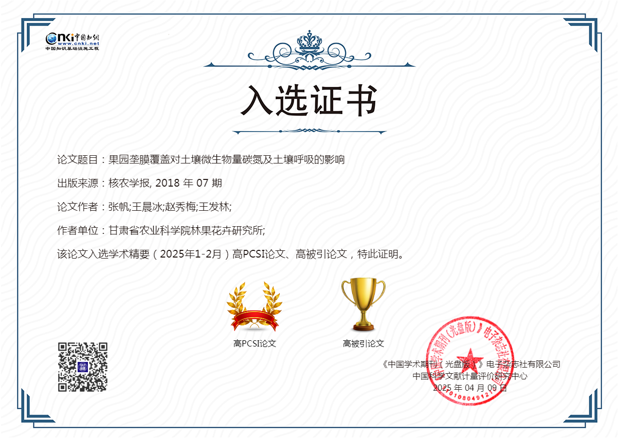 4月9日,省农科院林果花卉研究所发表于《核农学报》2018年第32卷第7期的论文“果园垄膜覆盖对土壤微生物量碳氮及土壤呼吸的影响”,被中国科学文献计量评价研究中心评为“学术摘要(2025年1-2月)高PCSI论文、高被引论文”。