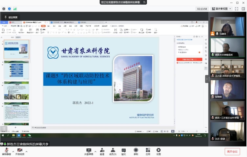 1月12日,由新疆农业大学牵头组织的国家重点研发计划重点专项子课题“跨区域联动防控技术体系构建与应用”启动会在线上顺利召开。我院植保所所长郭致杰就梨火疫病、苹果蠹蛾、番茄潜叶蛾等农业入侵生物区域防控技术体系和应用模式构建及集成应用示范等相关内容做了汇报,交流了项目研究内容、区系划分、拟解决的关键问题、研究方法和预期考核目标等,提出了AWM-IPM大区联动综合防控模式、检疫病虫害应急防控预案及超前防治技术储备等观点,对确保项目高质量完成及检疫性病虫害阻滞蔓延、应急防控处置具有很强的建设性意义。