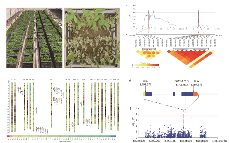 作者首先对包含234个F6:10家系(中黄35×晋豆21)的重组自交系(RIL)和一个由259个大豆品种组成的自然群体进行干旱胁迫处理,通过单核苷酸多态性(SNP)标记构建的遗传图谱,两个环境下在大豆7条染色体上定位到18个数量性状位点(QTL),包括了9个QTL簇(图2)。通过全基因组关联分析(GWAS)在大豆19条染色体中定位到53个QTL,包含了69个显著关联SNP(-log10(P)≥3.97)。之后通过连锁分析和关联分析的共定位、区域关联分析,在大豆第7染色体上预测了一个与反复干旱存活率相关的抗旱基因。本研究的研究结果将为大豆苗期抗旱基因的克隆和分子标记辅助选择奠定基础。