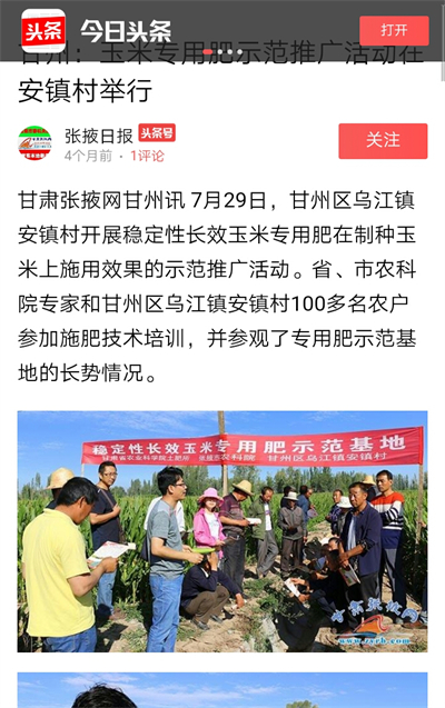张掖日报报道玉米长效缓释专用肥在张掖示范