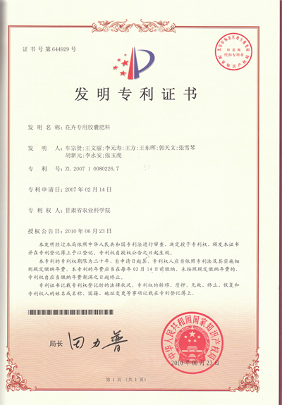 花卉专用胶囊肥由甘肃省农业科学院土壤肥料与节水农业研究所研制,具有胶囊外衣,含大、中、微量元素及多种氨基酸,营养全面,肥效持久、绿色、安全,施用方便。直接将胶囊插入土壤中便可,该产品属中性肥料,适用于各类土质及各类花卉。能促进花卉快速生长,叶茂花艳,并且对防治新叶黄化,防止落花、落叶、落果有显著效果。该产品获国家发明专利和甘肃省专利三等奖。