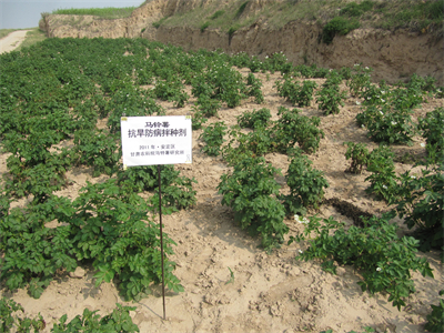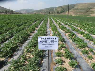 1、成果简介:针对土壤干旱和马铃薯种薯切块后失水较快、种块容易腐烂,导致马铃薯出苗不齐、田间缺苗断垄、生长发育不良等问题,甘肃省农业科学院马铃薯研究所在多年试验研究基础上,研制出马铃薯拌种剂,由国家知识产权局于2014年授权发明专利,专利号ZL201210097283.7。