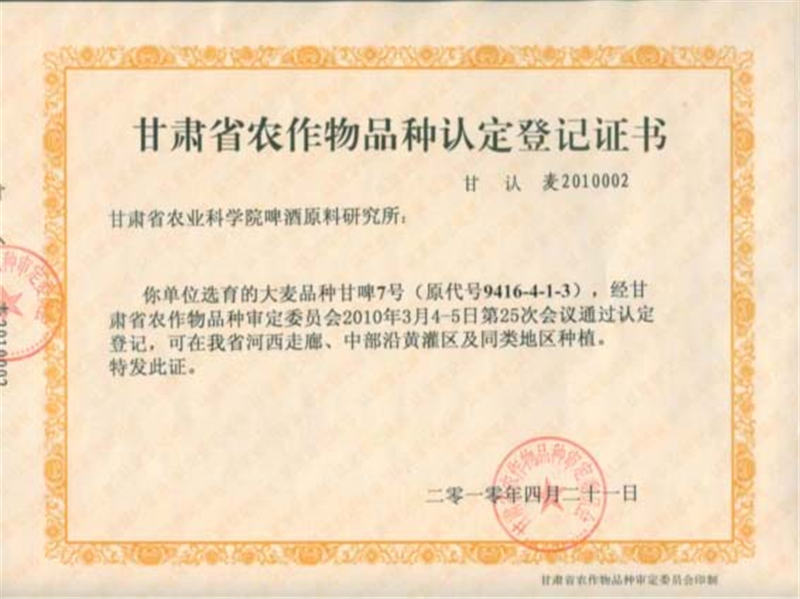 啤酒大麦新品种甘啤7号由甘肃省农科院经济作物与啤酒原料研究所于1994年以8759-7-2-3为母本、KRONA为父本通过有性杂交配制组合,以系谱法为选育手段,经过连续多代系统选育而成。2010年通过甘肃省农作物品种认定委员会认定(甘认麦2010002),2015年经全国小宗粮豆品种鉴定委员会鉴定(鉴定编号:国品鉴杂2015013;证书编号:2015-1-51),同年通过中华人民共和国植物新品种权保护(品种权号:CNA20090823.2;证书号:第20155273号)