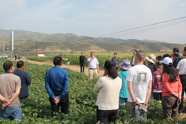 随后,全体人员观摩了我所承担的国家重点研发计划课题“西北区马铃薯化学肥料和化学农药减施技术模式集成与示范”项目在定西市鲁家沟和会宁县韩集镇苟岘村红玉马铃薯合作社基地。项目主持人吕和平研究员为大家介绍了 “双减项目”的试验设置,实施以及目前的进展情况。
