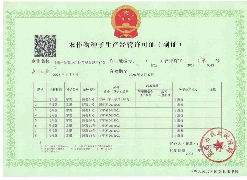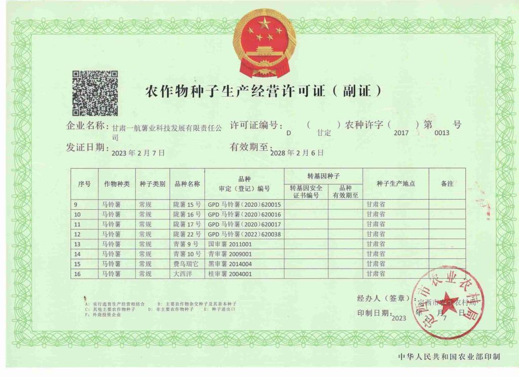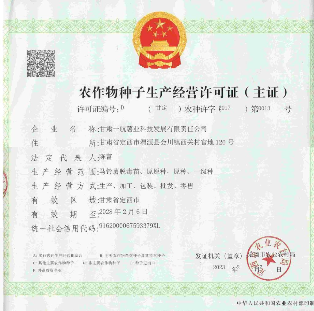 公司拥有脱毒无菌操作室500m2、全日光节能温室11000m2、日光网室20000m2,种薯贮藏窖5000m2,年生产马铃薯脱毒苗1000万株、微型薯1000万粒、原种一级种10000吨。目前生产经营的马铃薯主要有陇薯7号、陇薯10号、陇薯3号、陇薯12号、陇薯14号、陇薯15号、陇薯16号、陇薯22号、陇薯23号、陇薯红1号、陇薯紫2号、L0109-4、L16101-8等陇薯系列品种以及费乌瑞它、大西洋、冀张薯12号、V7、X6、沃土5号、青薯9号、青薯10号等品种,销售网络遍及甘肃、新疆、内蒙、陕西、四川、西藏、青海、宁夏、山西、河北、重庆、云南、广东等地。